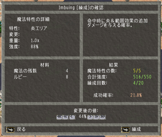さらに回避低下、マナリ、スタリ、炎エリアを88%ずつ練成。